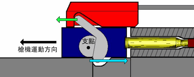 當子彈擊發時,其產生的後座力會藉由空彈殼傳導到槍機,讓後者向後運動。此時槍機與機匣的相對運動讓機匣對槓桿短的一端施加一個向前的力、也就是下方圖二的淺藍色箭頭。