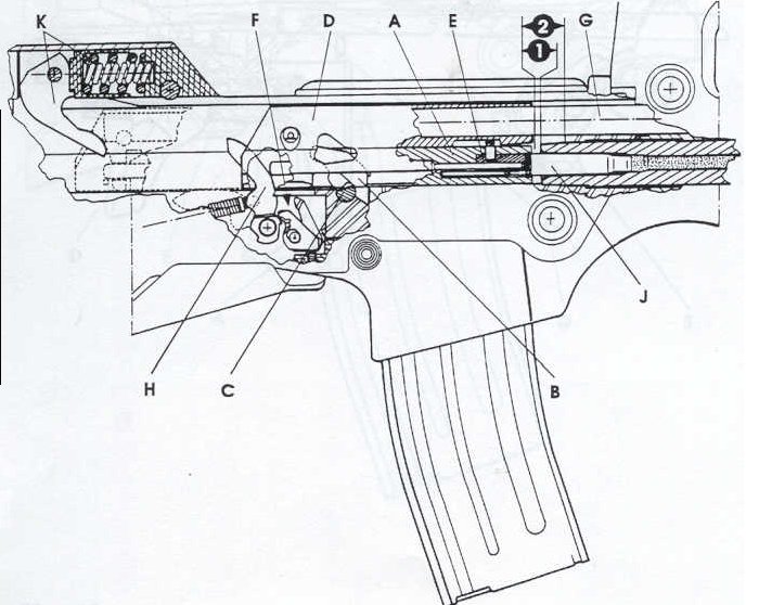 等到槓桿完全打平,槍機與槍機套才能以相同速度往後退,同時也把空彈殼抓出來進行拋殼。如前幾篇我們介紹過的槍機原理一樣,槍機在運動到幾部的過程中會順便把擊槌設至待發狀態,最後當槍機抵達底部被緩衝彈簧(K)停住後,被壓縮的往復彈簧(G)會將它再次帶回來、裝上下一發子彈準備擊發。
